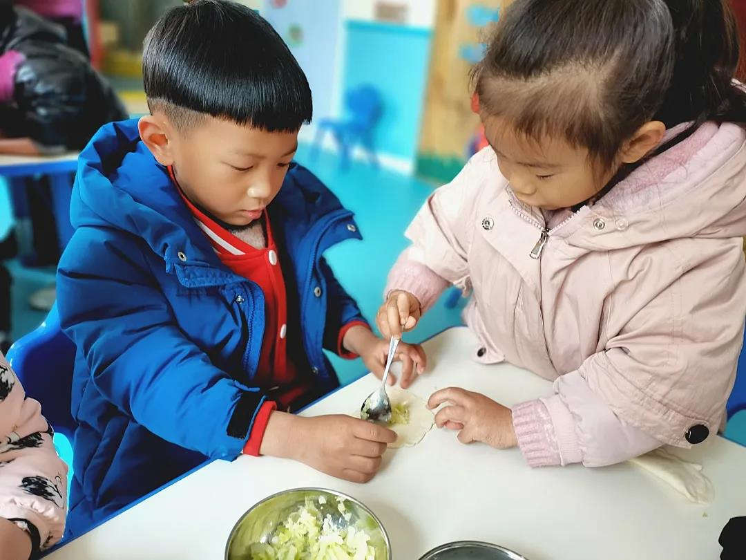? ? ? ?今天,在老師們的精心準備下孩子們認真的學習包餃子,有的用橡皮泥包出五顏六色創意十足的餃子,有的則真槍實彈包美味的餃子。雖然孩子們包的有些不美觀,但是吃著自己制作的餃子格外的香甜。通過包餃子環節,也讓孩子們懂得了食物制作的過程,參與食物制作,讓孩子明白可以做的事情有很多,要做一個有擔當的小朋友。