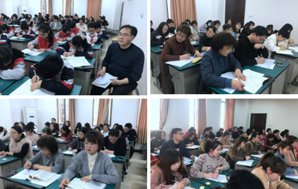 研討課競賽期間,王禮琴校長,副校長張水秀、曹蕓等校領(lǐng)導(dǎo)幾乎每堂課都親臨現(xiàn)場。聽課的老師們也都邊聽邊做聽課記錄。