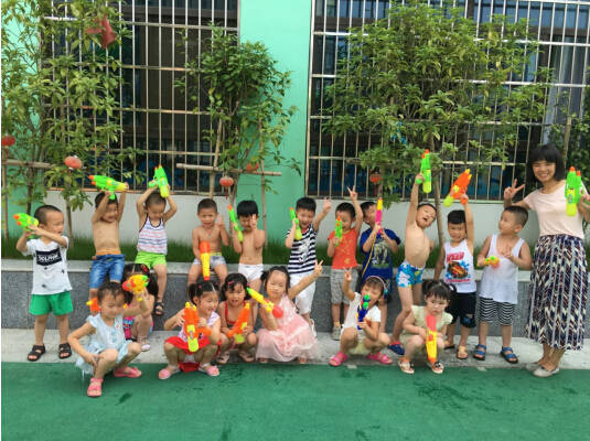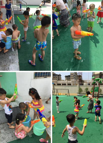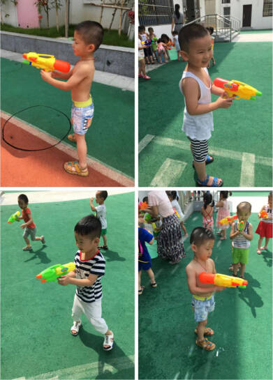 隨著老師的一聲令下,活動開始。孩子們在歡聲笑語中你打我一槍,我打你一槍,你追我,我追你,玩得可起勁了!一時間,操場上熱鬧非凡,飛濺的水花,爽朗的笑聲、加油聲、吶喊聲像一個個美妙的音符在迪斯尼幼兒園上空翩翩起舞。