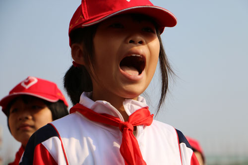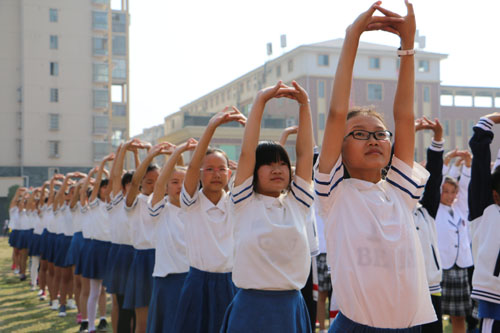 全場(chǎng)學(xué)生進(jìn)行做出“奮發(fā)向上”的動(dòng)作