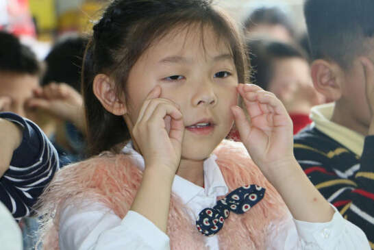 在老師帶領(lǐng)下,小朋友正在做眼保健操