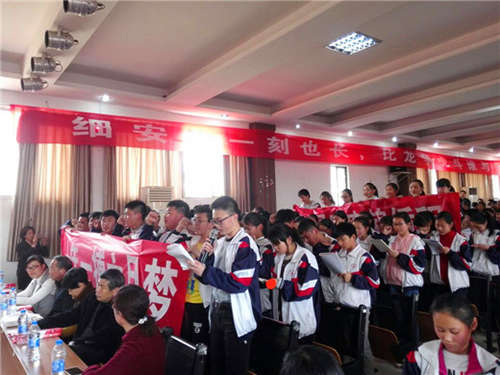 隨后,初三教師代表程興國(guó)老師作了一場(chǎng)熱情洋溢的沖刺動(dòng)員講話,“為了大家能夠更加出類拔萃;為了大家能夠成為祖國(guó)的棟梁之才。我們傾其所有,助你們揚(yáng)帆遠(yuǎn)航,你們舉胸中豪情,與雷霆碰杯,傾熱血滿腔,同日月?tīng)?zhēng)光?!蹦且痪渚溏H鏘有力、震撼人心的聲音賦予現(xiàn)場(chǎng)每個(gè)人奮進(jìn)的信心與勇氣。話音剛落,初三全體教師個(gè)個(gè)斗志昂揚(yáng),在主席臺(tái)大聲宣誓,我們一定做你們的堅(jiān)強(qiáng)后盾,為你們領(lǐng)航。請(qǐng)同學(xué)們以百倍的信心,銳不可當(dāng)?shù)臍鈩?shì)來(lái)面對(duì)著一百天。接著學(xué)生代表萬(wàn)新晨同學(xué)代表全體畢業(yè)生承諾:我們將以飽滿的情緒、昂揚(yáng)的斗志,調(diào)動(dòng)起全部的智慧,凝聚起全部的熱情,全身心地備戰(zhàn)中考。以優(yōu)異的成績(jī),給母校一個(gè)奇跡,給老師一個(gè)驚喜,給家長(zhǎng)一個(gè)安慰!李亞萱同學(xué)的母親發(fā)言更是讓我們感受到了社會(huì)對(duì)我們學(xué)校工作的支持與認(rèn)可。