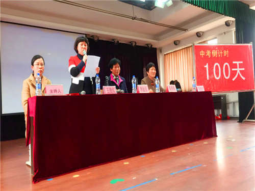 會(huì)議在雄壯激昂的國(guó)歌聲后,李金玉校長(zhǎng)、陳勇鋒副校長(zhǎng)作為校領(lǐng)導(dǎo)代表在全體師生的共同見(jiàn)證下,拉開(kāi)了百日沖刺的倒計(jì)時(shí)牌匾,那醒目的“100天”字樣燦爛生光,照進(jìn)了每一個(gè)師生的心間。會(huì)上,李金玉校長(zhǎng)作了動(dòng)員報(bào)告,她講到,中考的路上不單單是知識(shí)的較量,更重要的是心態(tài)的較量,還有毅力、耐力、意志品質(zhì)的考驗(yàn)。每個(gè)同學(xué)都要有鍥而不舍、孜孜以求、拼搏奮斗的精神,要有贏的強(qiáng)烈欲望。并希望全體教師以最佳的備課方案、優(yōu)質(zhì)的課堂教學(xué)、真摯的感情與學(xué)生們同舟共濟(jì),做好最堅(jiān)強(qiáng)的后盾。請(qǐng)同學(xué)們把父母的聲聲叮嚀,師長(zhǎng)們的殷切期盼化著動(dòng)力。用100天給自己一個(gè)機(jī)會(huì),用100天為自己創(chuàng)造一個(gè)奇跡,用100天送給關(guān)愛(ài)你的人一個(gè)“驚喜”。讓我們挑戰(zhàn)2017年的中考,再創(chuàng)學(xué)校的輝煌!