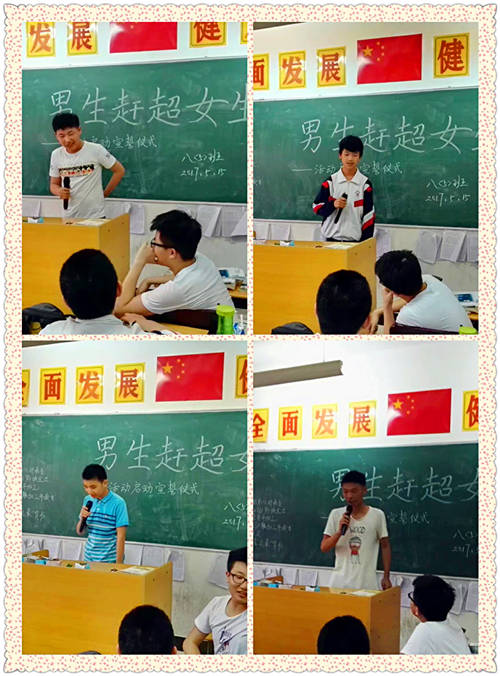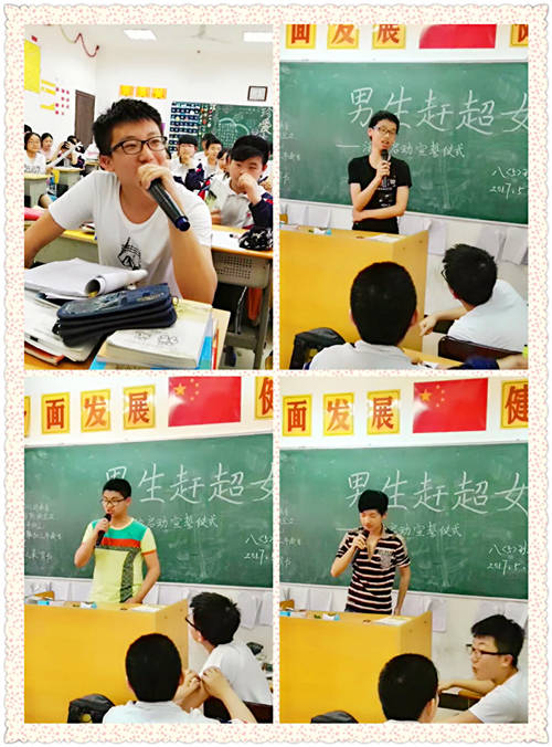 4點(diǎn)45分,胡老師走進(jìn)教室,在黑板上瀟灑地寫(xiě)下"男生趕超女生" 活動(dòng)啟動(dòng)儀式幾個(gè)大字。大家都丈二和尚摸不著頭腦,不知道胡老師這葫蘆里賣(mài)的是什么藥,為什么要開(kāi)展這次活動(dòng)呢?別急,你看,胡老師一轉(zhuǎn)身,用響亮的聲音說(shuō)道:“ 同學(xué)們,這段時(shí)間里。我發(fā)現(xiàn),班上女同學(xué)學(xué)習(xí)積極性特別高,經(jīng)常向老師請(qǐng)教問(wèn)題,學(xué)習(xí)態(tài)度非常好。但男生,相對(duì)而言,學(xué)習(xí)態(tài)度不夠認(rèn)真。所以這次班會(huì)我們舉行“男生趕超女生” 活動(dòng)啟動(dòng)宣誓儀式,讓男同學(xué)們說(shuō)說(shuō)自己的趕超目標(biāo)?!?我們這才恍然大悟。
