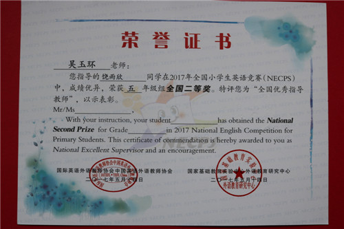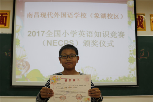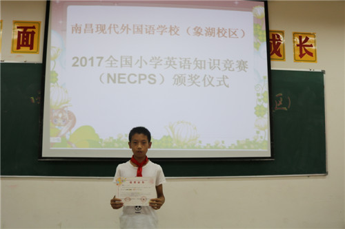 本次競賽,南昌現(xiàn)代外國語學(xué)校(象湖校區(qū))經(jīng)過初賽選拔,共170多名學(xué)生進(jìn)入決賽。從初賽到?jīng)Q賽短短一個月的時間,我校20名英語老師每天利用放學(xué)后及中午休息時間,采取集中、分散、個別輔導(dǎo)的形式,由英語教研組長負(fù)責(zé)組織有針對性地進(jìn)行輔導(dǎo),老師之間經(jīng)常在一起相互交流輔導(dǎo)方法,商討難題,并做到每天跟家長溝通與交流,讓家長配合督促孩子在家完成復(fù)習(xí)任務(wù)。功夫不負(fù)有心人,在決賽中,我們學(xué)校有九名學(xué)生分別獲得了國家級二、三等獎;有70名學(xué)生獲得市級一等獎;90多名學(xué)生獲得市級二等獎;7名教師獲得“全國優(yōu)秀指導(dǎo)教師”光榮稱號;學(xué)校獲得了第十屆全國小學(xué)生英語競賽優(yōu)秀組織獎。本次比賽獲得優(yōu)異成績,是對參賽學(xué)生刻苦學(xué)習(xí)的肯定,是輔導(dǎo)老師辛勤指導(dǎo)的回報。