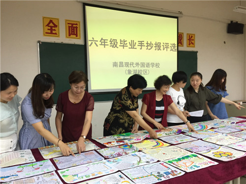 本次活動得到老師和孩子們的熱烈響應(yīng)。他們利用休息時間,認真搜集資料,精心設(shè)計版面。根據(jù)自己的理解,用優(yōu)美的文字、精湛的畫藝、合理巧妙的編排設(shè)計手抄報。張張手抄報傳遞出的都是孩子們對母校的感激、對老師的依戀、對未來的憧憬、對理想的堅定。在班級初評的基礎(chǔ)上,每班精心選出5幅優(yōu)秀作品參加學(xué)校評選,全校共收到學(xué)生手抄報作品35份。6月29日下午,多媒體教室熱鬧非凡,以校長李金玉為組長,年級組長、美術(shù)老師為成員的評審小組,正在對學(xué)生作品進行評選。最后評出一等獎4名、二等獎8名、三等獎12名。