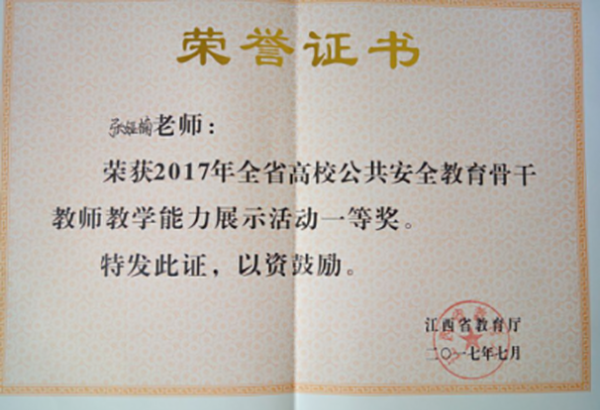 秋季開(kāi)學(xué)前夕,從省教育廳傳來(lái)喜訊,省教育廳文件“關(guān)于2017年全省高校公共安全教育骨干教師教學(xué)能力展示活動(dòng)結(jié)果的通報(bào)”(贛教穩(wěn)定字[2017]15號(hào)) 列出了參加這次活動(dòng)的獲獎(jiǎng)名單 ,全省共有83所高校參加比賽,江西工商職業(yè)技術(shù)學(xué)院張婭楠老師榮獲全省高校專科組一等獎(jiǎng)。