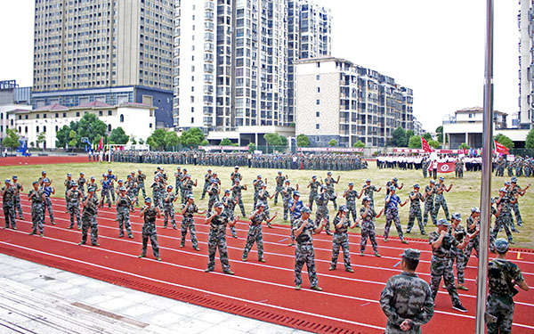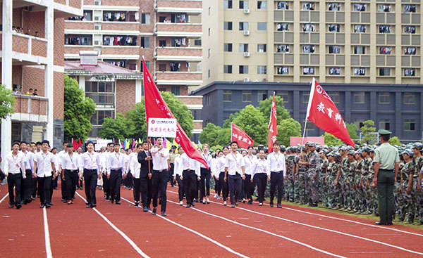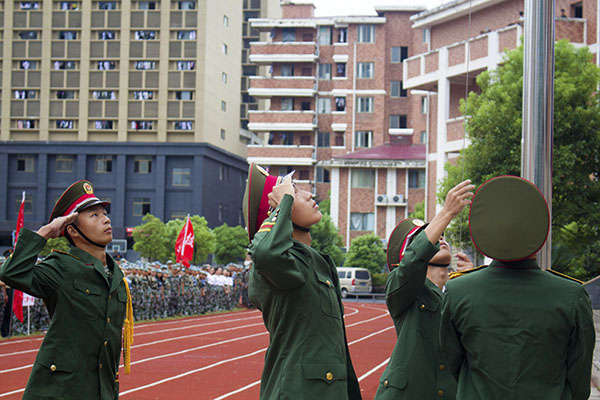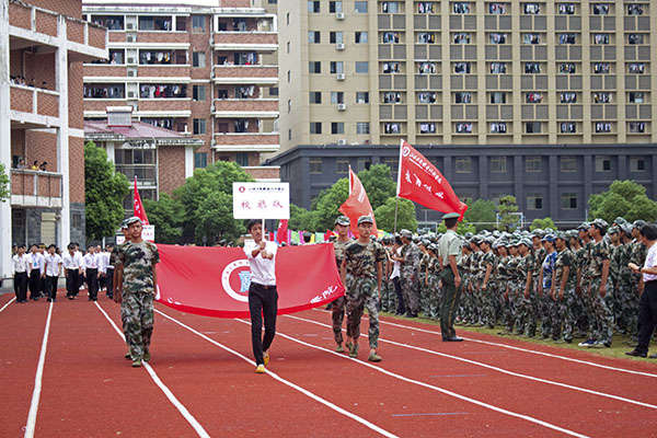 伴隨著莊嚴的國歌聲,五星紅旗冉冉升起,在操場上空迎風飄揚。隨后是全校軍訓新生分批進行隊列匯報表演,統(tǒng)一的迷彩裝,整齊的步伐,體現(xiàn)了工商新生在新學期飽滿的熱情和積極的態(tài)度。院長劉明初走到學生方隊中進行檢閱。一句句嘹亮的口號聲響徹云霄,一組組方陣從主席臺前經(jīng)過,同學們個個精神飽滿,軍姿挺拔,在教官的帶領(lǐng)下邁著整齊的步伐昂向前,出色的表現(xiàn)不時贏得現(xiàn)場領(lǐng)導和老師的陣陣掌聲。