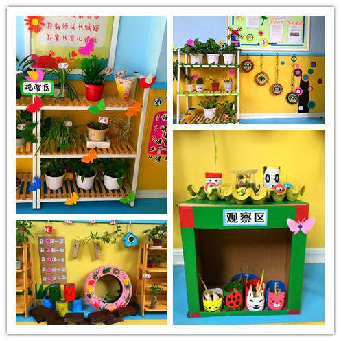 各班秉承著季節(jié)性、豐富性、童趣性、探索性、參與性的理念,創(chuàng)設了具有本班特色的自然角。各自然角都有自己的主題,如觀賞區(qū)、種植區(qū)、實驗區(qū)讓幼兒通過對植物連續(xù)性的觀察,了解植物的生長過程。教師們巧思妙想,利用蛋托、奶粉罐、泡沫盒、舊抽屜等各種材料加工制作成形態(tài)各異的花盆,種植不同的植物;同時讓幼兒參與對自然角的種植和管理,記觀察記錄,給植物澆水等,培養(yǎng)幼兒細致的觀察力,形成管理好自然角的責任感。
