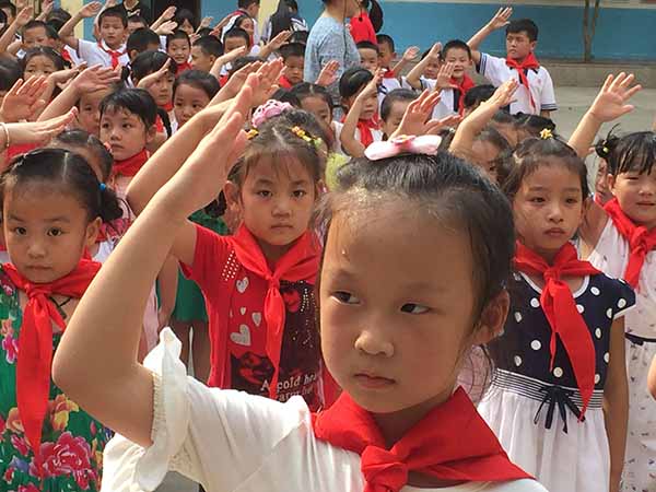 儀式中,歌聲嘹亮,隊(duì)旗、紅領(lǐng)巾格外鮮艷,在活動(dòng)中,由六年級(jí)的老隊(duì)員為180名新隊(duì)員佩戴了紅領(lǐng)巾,全體新入隊(duì)的同學(xué)在大隊(duì)輔導(dǎo)員謝珊珊老師的帶領(lǐng)下,在莊嚴(yán)的隊(duì)旗下,高高地舉起右手大聲宣誓,時(shí)刻準(zhǔn)備著為共產(chǎn)主義事業(yè)而奮斗!整個(gè)入隊(duì)儀式規(guī)范而且隆重,洋溢著濃濃的溫暖之情,孩子們無(wú)比幸福和自豪的眼神告訴我們,他們定會(huì)在星星火炬的指引下,牢記黨的教誨,全面發(fā)展,茁壯成長(zhǎng)。入隊(duì)儀式在全體師生熱烈的掌聲中圓滿結(jié)束。