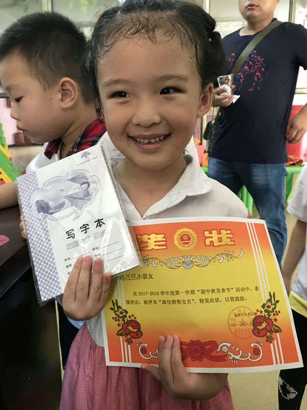 本次活動還特別準備了十名“最佳銷售寶貝”獎,通過賣食物的速度來評出前十名。還有二十名“小小美食家庭”獎,“小小美食家庭”是從每個班選出五組精美食物頒發(fā)該獎項。若干名 “積極小寶貝”獎則是評選積極參與的小朋友們獲得該榮譽。
