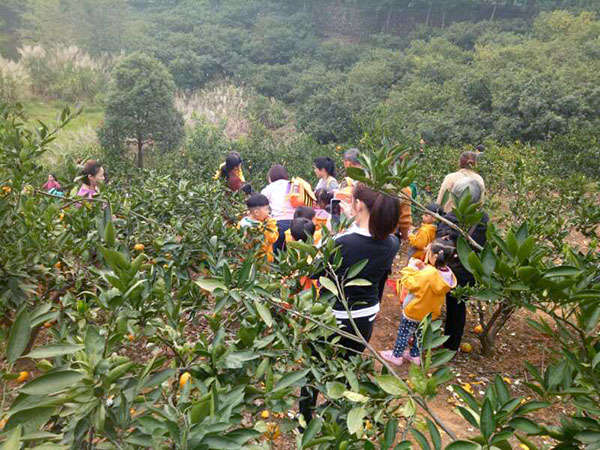 在這綠樹掩映,青水環(huán)繞的大自然中,各班精心組織了親子游戲,孩子們就像放飛的小鳥,在大自然中感受自由和快樂。游戲結(jié)束后,孩子們在爸爸媽媽、爺爺奶奶的帶領(lǐng)下進入果園采摘桔子,撿板栗……果園里金色的桔子掛滿枝頭,孩子們身穿紅色、黃色的校服孩子容入綠色和金色的果園里,遠遠望去,就像一道道彩帶,在山中游動,為這果園增設(shè)了一道亮麗的風景線。家長和孩子們在這山青水秀的中盡情嬉戲,歡笑聲響徹溶入山水之中。