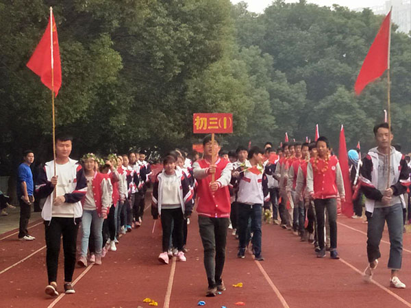 下午兩點(diǎn),運(yùn)動(dòng)會(huì)入場儀式在初中部鄧華校長充滿激情的開幕式致辭中正式開始。伴隨著雄壯的《運(yùn)動(dòng)員進(jìn)行曲》國旗護(hù)衛(wèi)隊(duì)踏著整齊的步伐率先經(jīng)過主席臺(tái)接受檢閱,整齊劃一、嚴(yán)肅莊重。?;贞?duì)、彩旗隊(duì)緊隨其后,精神抖擻、意氣風(fēng)發(fā)。41支班級(jí)方陣代表隊(duì)壓軸入場,或變換隊(duì)形,或揮舞花球,或翩翩起舞,口號(hào)嘹亮、氣勢恢宏。