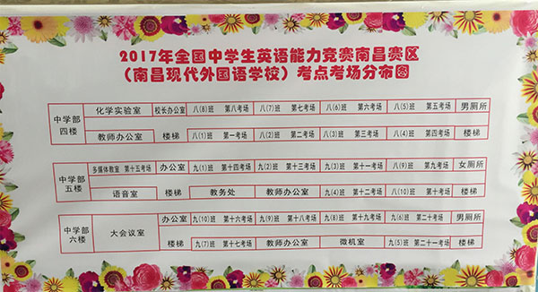 11月12日,2017年全國中學(xué)生英語能力競賽(NECPS)初賽南昌賽區(qū)在我校舉行,來自來自多校600多名學(xué)生參加考試。作為本次初賽的考點之一,我校領(lǐng)導(dǎo)高度重視此項工作,從監(jiān)考教師的配備到橫幅及考場指示牌、考點分布圖的溫馨提示,都做好了充分的準(zhǔn)備??记?,學(xué)校組織全體考務(wù)人員進(jìn)行了培訓(xùn)。在各部門的通力配合下,各考場布置嚴(yán)肅規(guī)范,很好地完成了考場布置等工作。