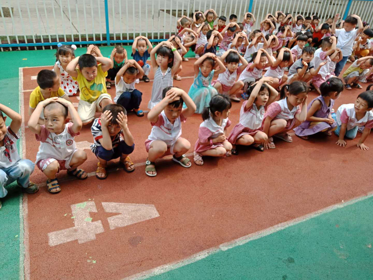 一分鐘后,信號員解除警報,各班教師組織幼兒用手或其他物品保護頭部,迅速有序地分別從各個安全通道緊急疏散到室外安全空曠的場地(一樓操場)。