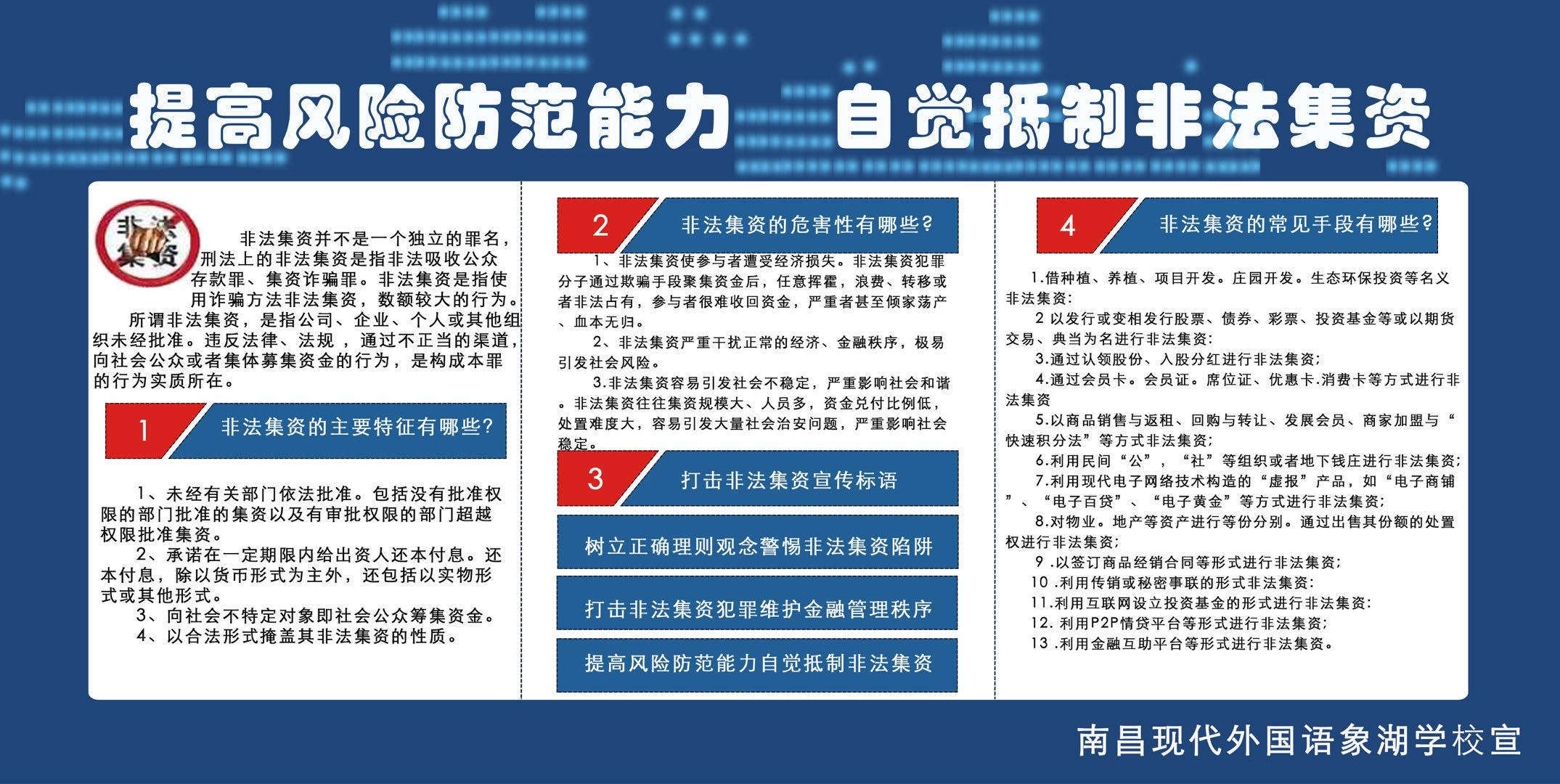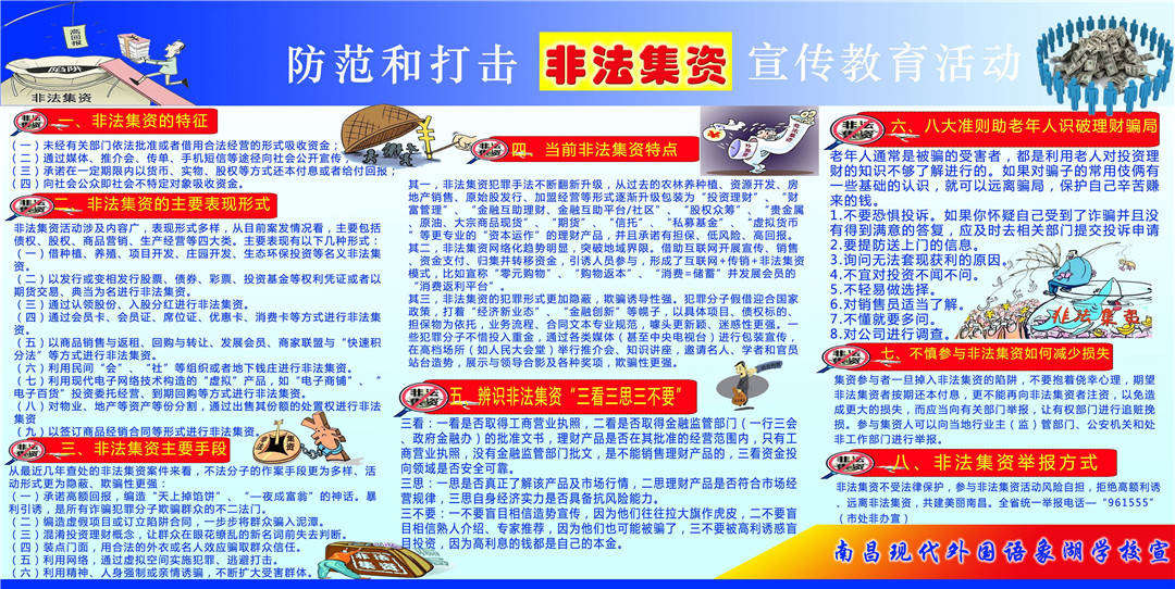 根據(jù)《南昌市2018年防范和打擊非法集資宣傳月活動(dòng)實(shí)施方案》要求,以保護(hù)人民群眾切身利益、維護(hù)社會(huì)穩(wěn)定為出發(fā)點(diǎn),提高社會(huì)公眾對(duì)非法集資的識(shí)別能力,教育人民群眾增強(qiáng)風(fēng)險(xiǎn)防范意識(shí),培養(yǎng)正確的投資理念,營(yíng)造防范打擊非法集資的良好輿論氛圍,震懾犯罪分子,并以此擴(kuò)大宣傳教育覆蓋面,增強(qiáng)宣傳效果,我校特開展防范和打擊非法集資宣傳教育進(jìn)校園活動(dòng)。
