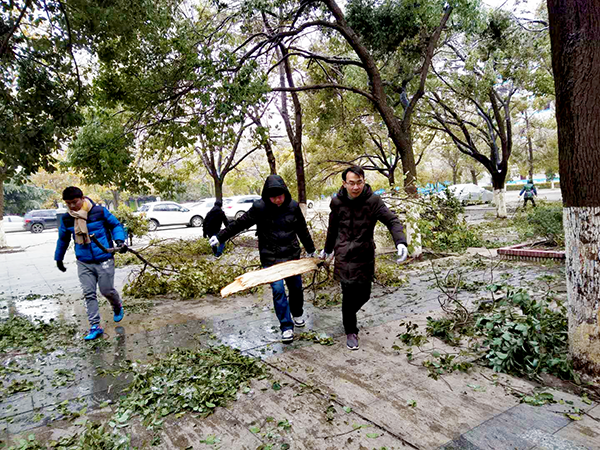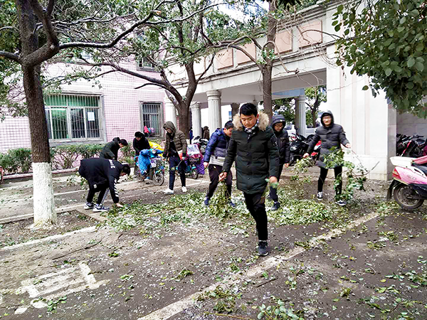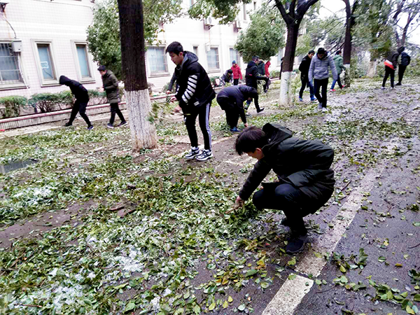 寒風凜冽,但絲毫沒有影響大家勞動的熱情。大家不懼寒冷、爭先恐后、相互配合,一點點地將凍雪和斷掉的樹枝清掃到校園的指定地點。熱火朝天的勞動畫面和忙碌的身影成為校園里一道靚麗的風景線。