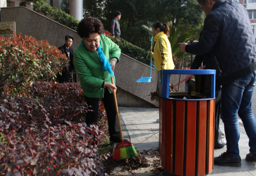 周瑾書記打掃垃圾桶旁樹葉