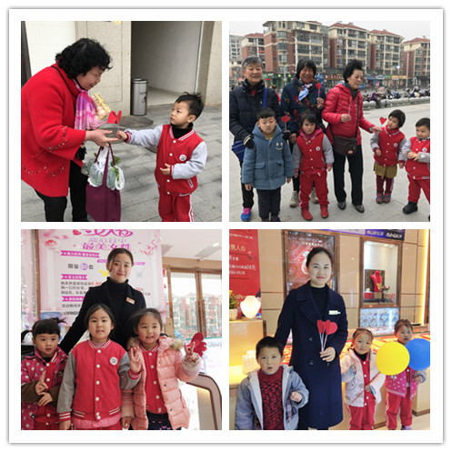 中班的小朋友們以“讓愛傳出去”為主題活動(dòng),教師帶著孩子們走出校園,來到了周邊的商場和小區(qū),給阿姨、奶奶們送上了美麗的手工花和祝福。激發(fā)幼兒對女性的感恩之情,懂得體會(huì)女性長輩的辛勞。在活動(dòng)開展的前一天,孩子們就把漂亮的花束制作好了,送花時(shí),孩子們偶有害羞,但都勇敢的把自己的花束送給女性們,并且自信的介紹著自己以及園所名字。