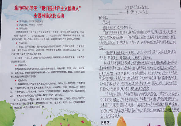 為深入貫徹團市委、市教育局、市學(xué)聯(lián)、市少工委《關(guān)于在青少年中深入開展“我們是共產(chǎn)主義接班人”主題團、隊宣傳教育活動的通知》的文件要求,進一步引導(dǎo)廣大共青團員、少先隊員樹立共產(chǎn)主義遠大理想,堅定跟黨走中國特色社會主義道路的信念和信心,增強青少年對黨和社會主義祖國的樸素感情,近日,南昌現(xiàn)代外國語學(xué)校(象湖校區(qū))積極組織全校學(xué)生開展了以“我們是共產(chǎn)主義接班人”為主題的書信文化活動。此次活動旨在通過專用郵資信封和信箋作為載體,以傳統(tǒng)書信傳遞真情的形式,深化團員和少先隊員對實現(xiàn)遠大理想要靠廣大青年腳踏實地奮斗的認識理解,讓青少年認識到共產(chǎn)主義理想的實現(xiàn)需要一代又一代人的接力奮斗,鼓勵學(xué)生們不僅僅要做一名好學(xué)生,更要成為一個有所擔(dān)當(dāng)?shù)墓伯a(chǎn)主義接班人。