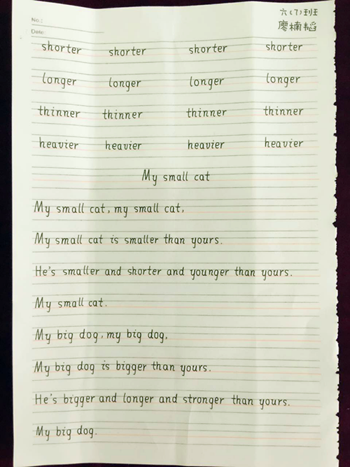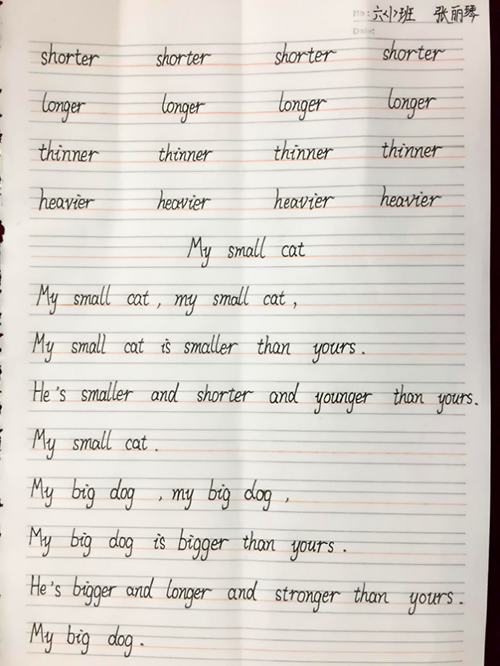通過這次英語書寫比賽,培養(yǎng)了學生認真書寫英文的意識,對學生良好習慣的養(yǎng)成起到了促進作用,豐富了學生的校園文化生活,也同學們學好英語打下良好的基礎。英語書法需要常抓不懈,今后,象湖校區(qū)還會堅持把書寫練習貫穿于整個英語教學之中,爭取更大的進步。